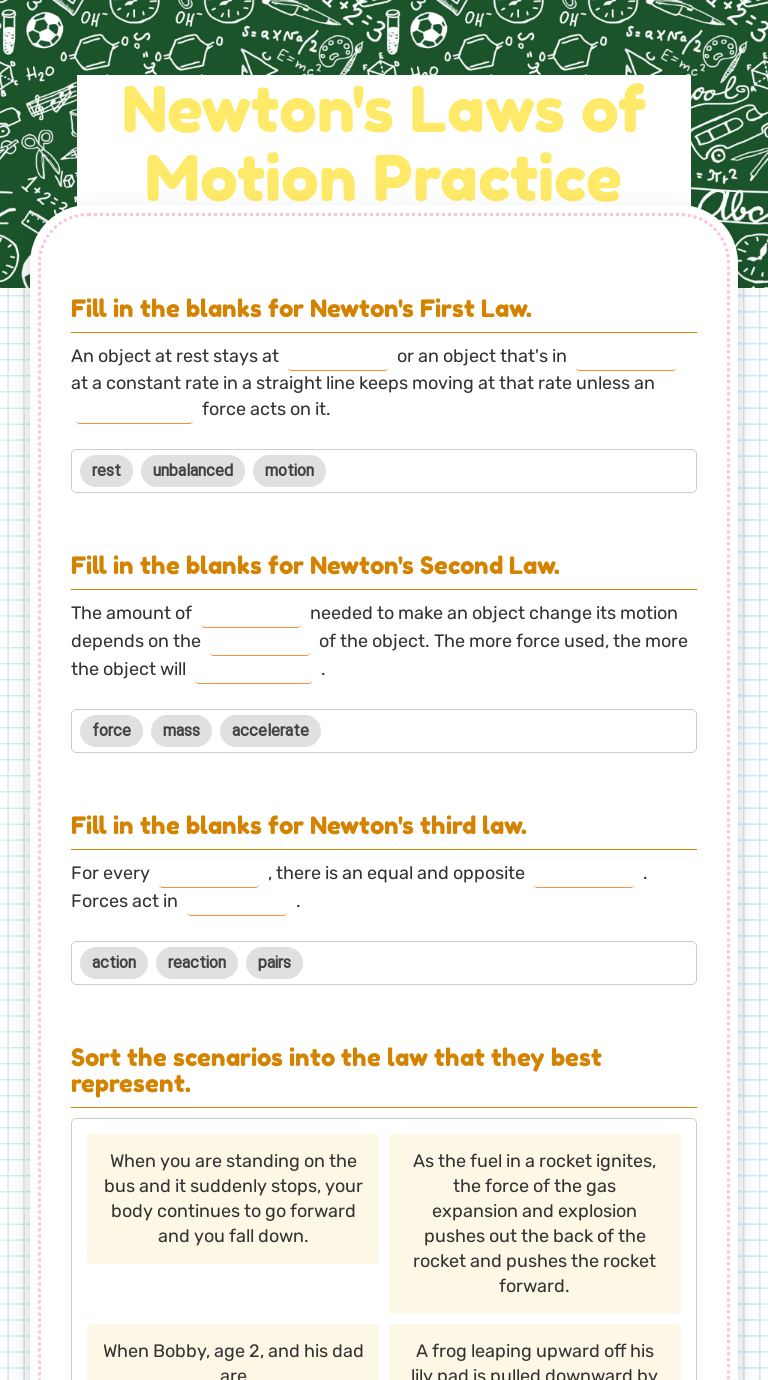 Newton's Laws Of Motion Practice Worksheet - Web newton's laws of motion explain many relationships in physics. Newton’s second law of motion states : Specifically, it relates forces to ideas like inertia,. Newton’s first law of motion states : Newton's laws of motion science > physics library > forces and newton's laws of motion > newton's laws of motion all of.