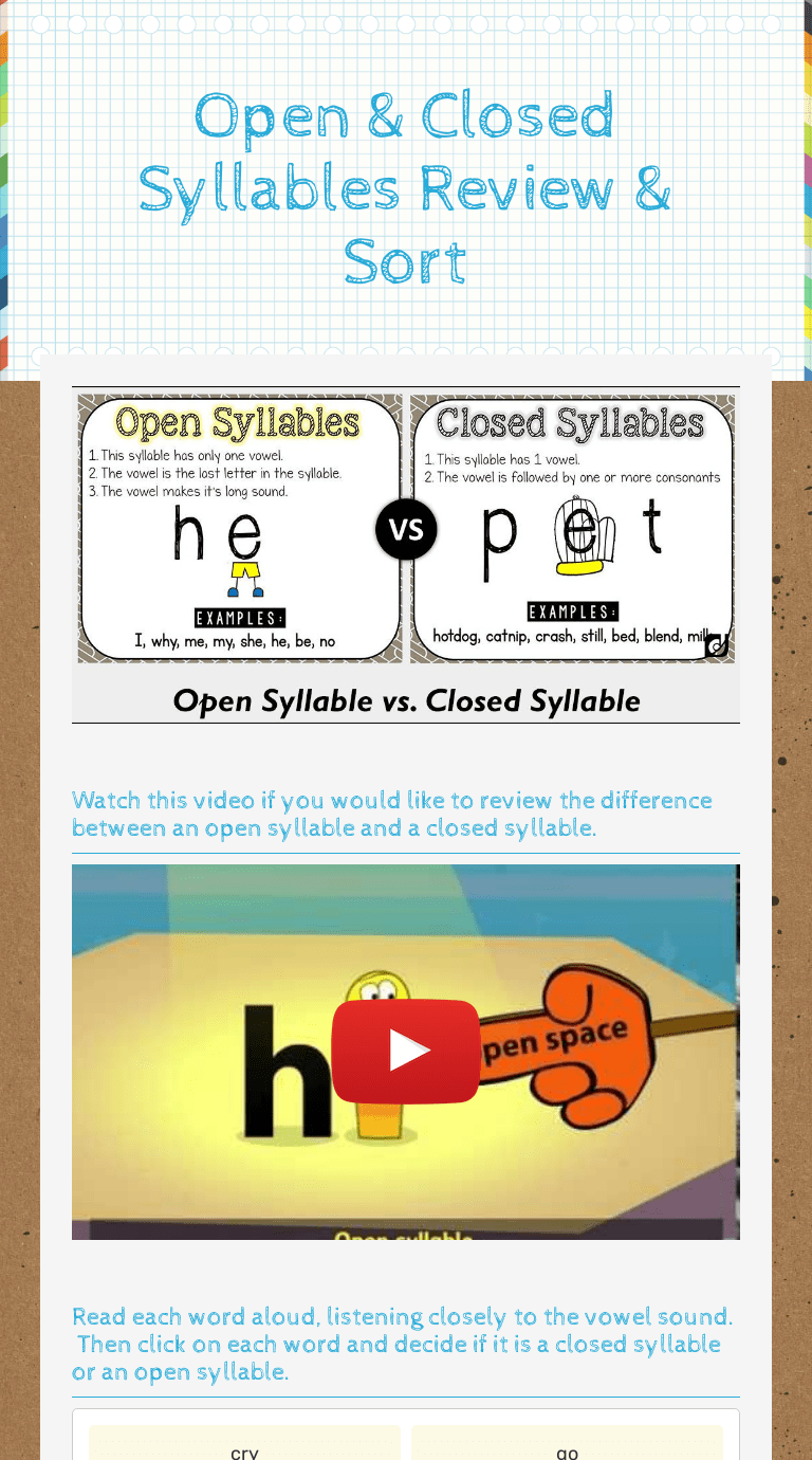 Web cut out the syllables and sort them under the open or closed door. If it’s an open syllable, draw the line to the open. This first grade activity helps students improve. Worksheet 1 worksheet 2 worksheet 3 rhyming. Web learn about open and closed syllables so that your kids can identify the differences in vowel. Web these pdf worksheets on sorting open and closed syllables are best suited for kindergarten through grade 3 kids. Syllable practice draw a line to the correct door. Separate the word into syllables with a slash mark (/). Web open and closed syllables worksheets to print: