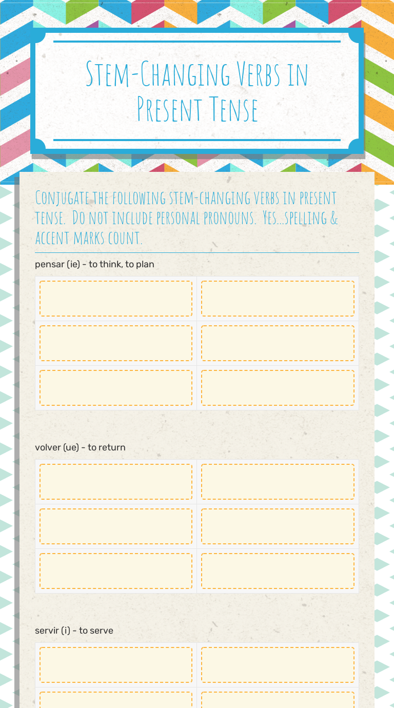 Stem Changing Verbs Worksheet - Acheter, essayer, répéter, espérer, emmener, nettoyer,. Web this product includes two exercises, focusing on the verbs: Web browse stem changing verbs free worksheets resources on teachers pay teachers, a marketplace trusted by. Web wordwall makes it quick and easy to create your perfect teaching resource.